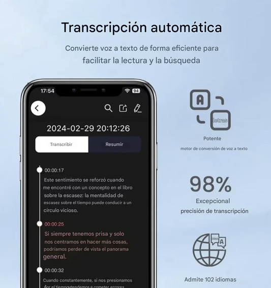 Grabadora de Voz AI Note – Grabadora de Alta Calidad con Control de App, Transcripción y Resumen con Tecnología AI