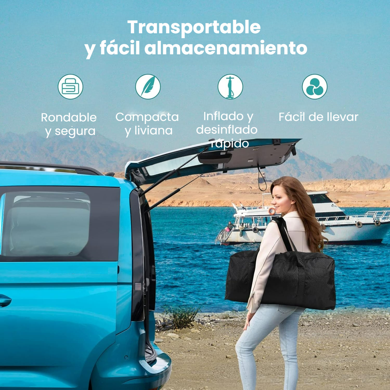 Lleva tu diversión acuática a cualquier lugar con facilidad. Nuestra isla flotante se desinfla rápidamente y se guarda en una práctica bolsa de transporte, haciendo que cada aventura sea simple de planificar y ejecutar.
