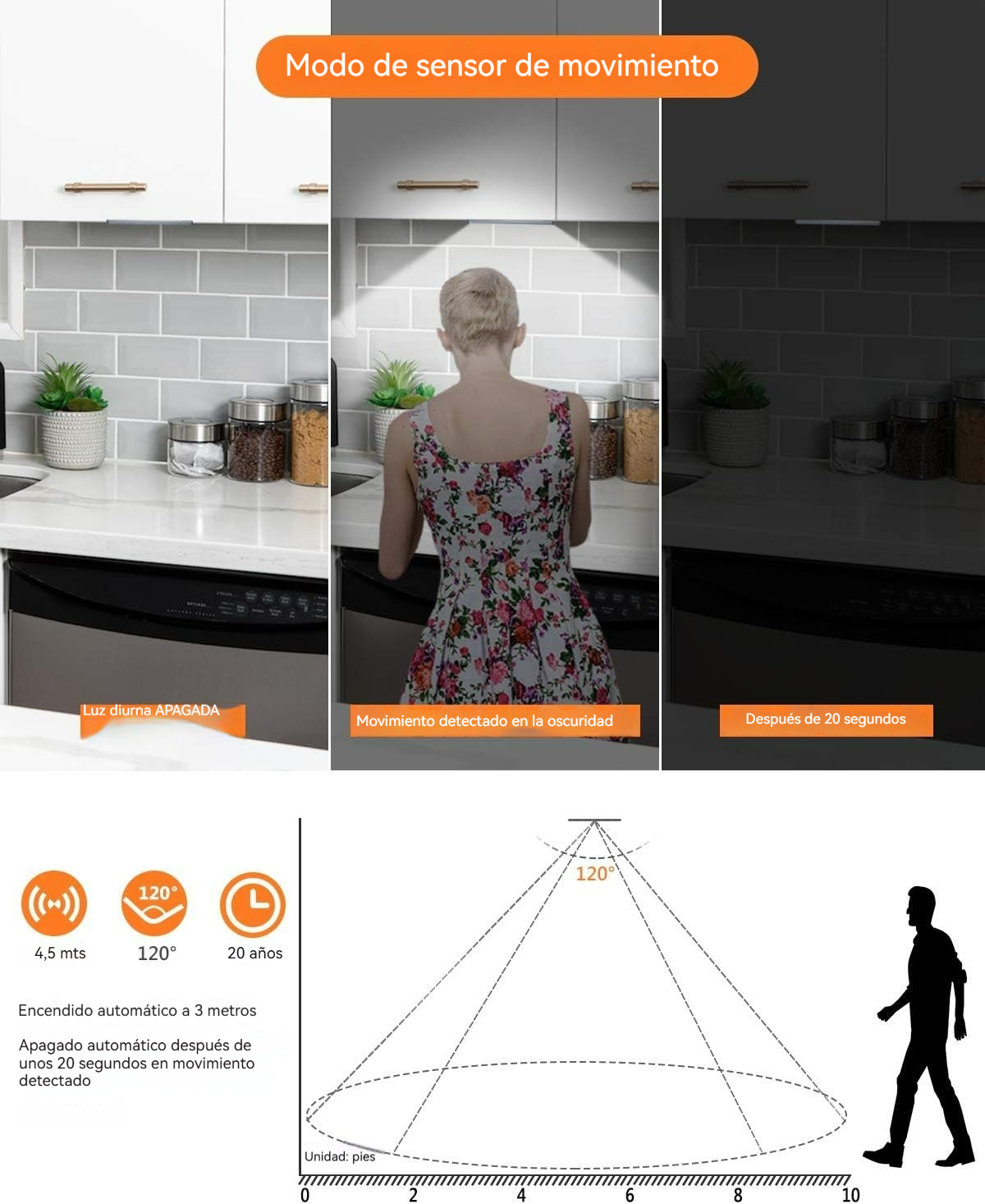 Detecta movimiento humano a menos de 3 m y se activa solo en condiciones de poca luz. Se apaga automáticamente tras 20 segundos sin actividad. Perfecta para no buscar interruptores en la oscuridad.