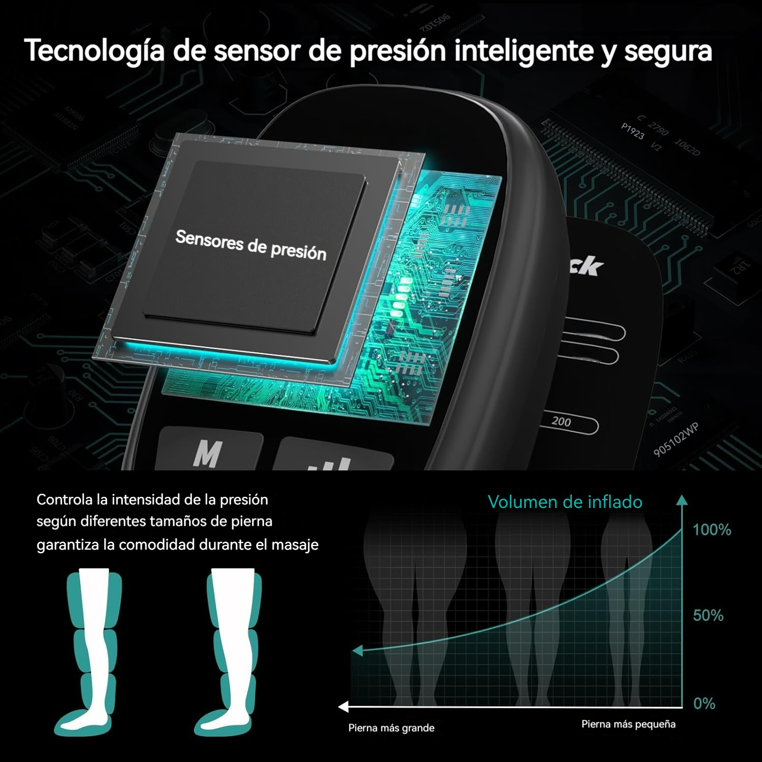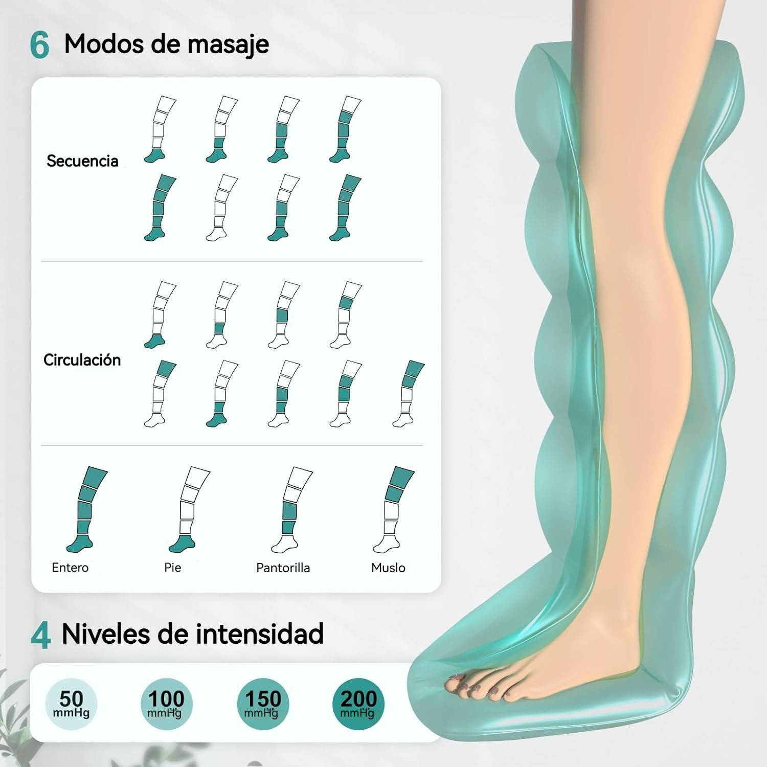 Sistema inteligente de compresión secuencial para piernas, ideal para recuperación muscular, alivio de fatiga y estimulación circulatoria. Sin cables, sin límites.