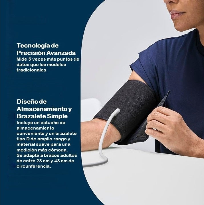 Este monitor de salud avanzada mide la presión arterial (sistólica y diastólica), el pulso y la actividad eléctrica del corazón de forma simultánea. Detecta alteraciones importantes como fibrilación auricular, taquicardia, bradicardia y ritmo sinusal para que siempre estés un paso adelante en tu bienestar.